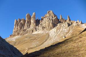 Sterzing - Grödnertal: Entlang der Eisack rollen erst mal flach oder leicht bergab vorbei an der Franzensfeste in die Bischofstadt Brixen mit dem wunderschönen Domplatz. Ein wenig folgen wir noch dem Eisacktal, dann beginnt die Auffahrt in das Bergdorf Lajen, den Urlaubsort, an dem morgens der Hahn kräht und abends die Grillen zirpen, wie auf der Website der Tourismusgenossenschaft zu lesen ist. Die Felsengipfel der Dolomiten rücken näher und begleiten uns auf dem Weg in das Grödnertal. [67 km, 1540 hm, F/A]