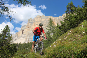 Strada della Vena // Variante II: Heute stehen die Dolomitenpässe Valparola und Falzarego auf dem Programm. Im Südwesten sieht man die Gletscher der Marmolada und zur anderen Seite bereits die "Cinque Torri". Diese weißen Felstürme und die oberhalb ge- legene Averau Hütte sind mit Seilbahnunterstützung unser nächstes Ziel. Ein grandioses Panorama erwartet uns. Die anschließende Trail-Abfahrt auf der "Strada della Vena" wird zurecht als einer der Traumtrails in den Alpen beschrieben! Über Contrin und Corvara geht es zurück nach La Villa. [55 km, 1780 hm, F/A]